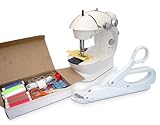 The LSS-202 from Michley is a mini sewing machine that features double thread, double speed and automatic thread rewind. You can use hand switch or foot pedal to start. Foot pedal, adaptor, and thread bag included. Uses DC 6-volt power. This combo kit also includes electrical ccissors and a 42-piece sewing kit. The sewing kit contains the following: 16 large thread rolls, 16 small thread rolls, 5 extra needles, 1 measuring tape, 1 pair of scissors, 1 thimble, 1 threader (helps put the thread in the needle) and 1 big needle.